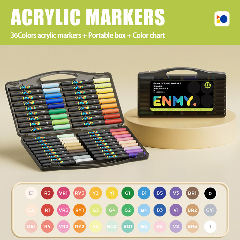Description Experience the future of acrylic painting with ENMY's innovative Direct Liquid Acrylic Markers. Our unique design ensures a consistent, silky smooth flow of vibrant, water-based ink, making every stroke effortless. The full tube of ink provides long-lasting use, while the professional color combinations offer endless creative possibilities. Perfect for artists of all levels, our markers are ideal for a wide range of surfaces, including canvas, wood, ceramic, and glass.