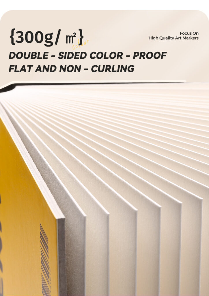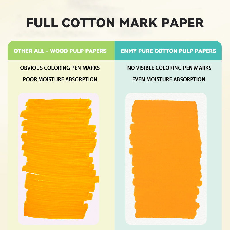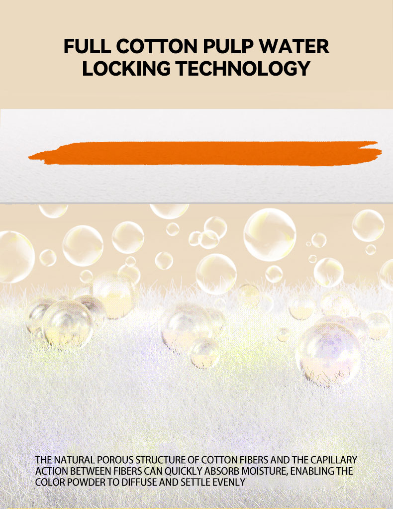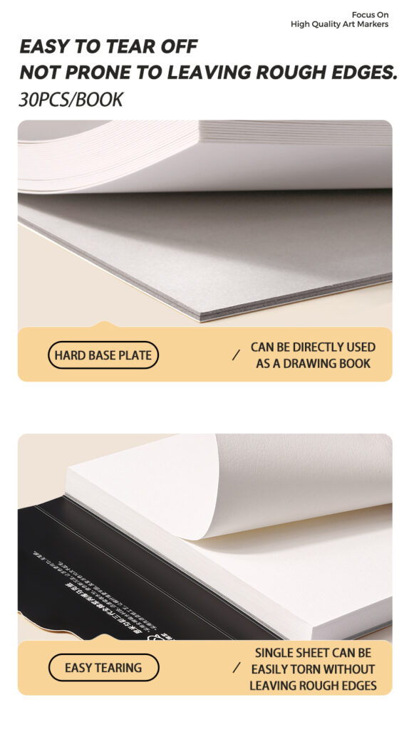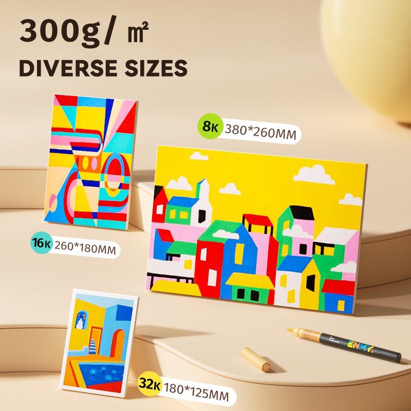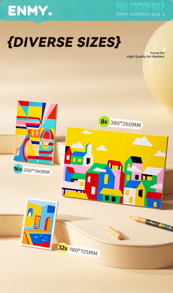 Crafted from 300g pure cotton with a fine texture, our paper features advanced cotton-based absorbent technology and sizing process. It ensures streak-free coloring, resists pilling, and allows colors to blend seamlessly for a professional finish. The single-sided adhesive design enables effortless sheet removal without fraying, while available sizes—8K, 16K, and 32K—cater to various artistic needs. Made from natural materials without fluorescent agents, this eco-friendly paper offers high color fidelity, providing the perfect canvas for acrylic marker masterpieces.
